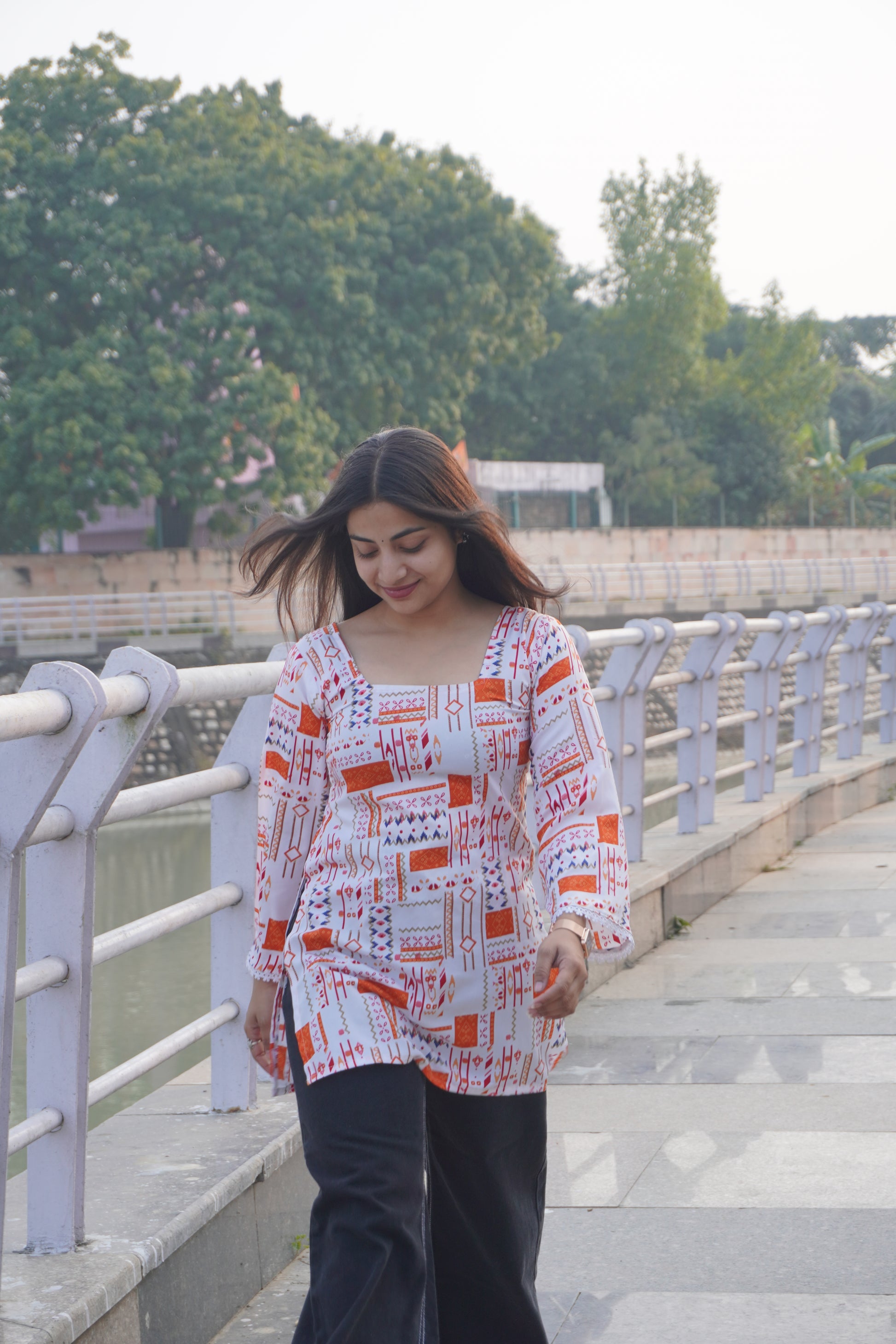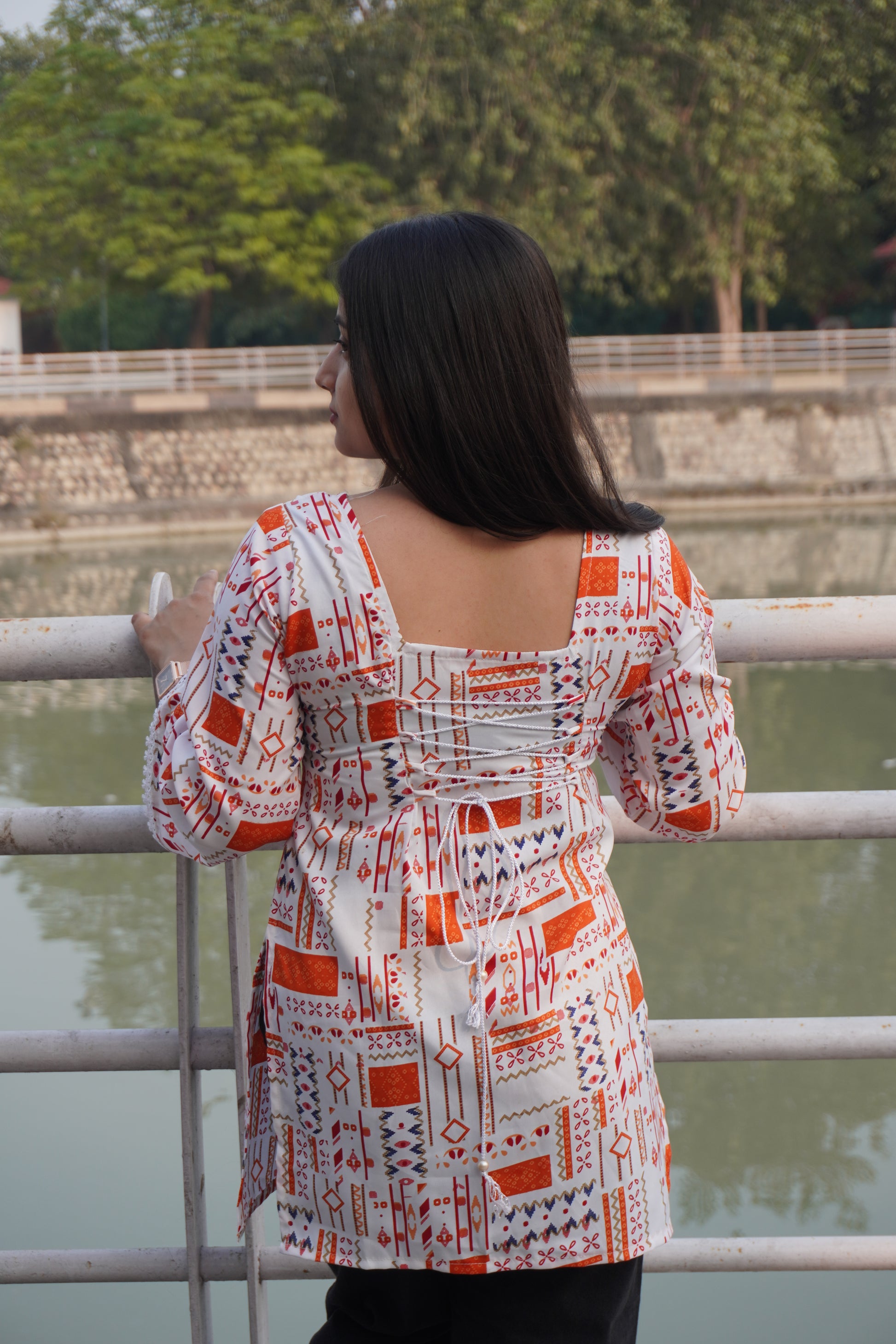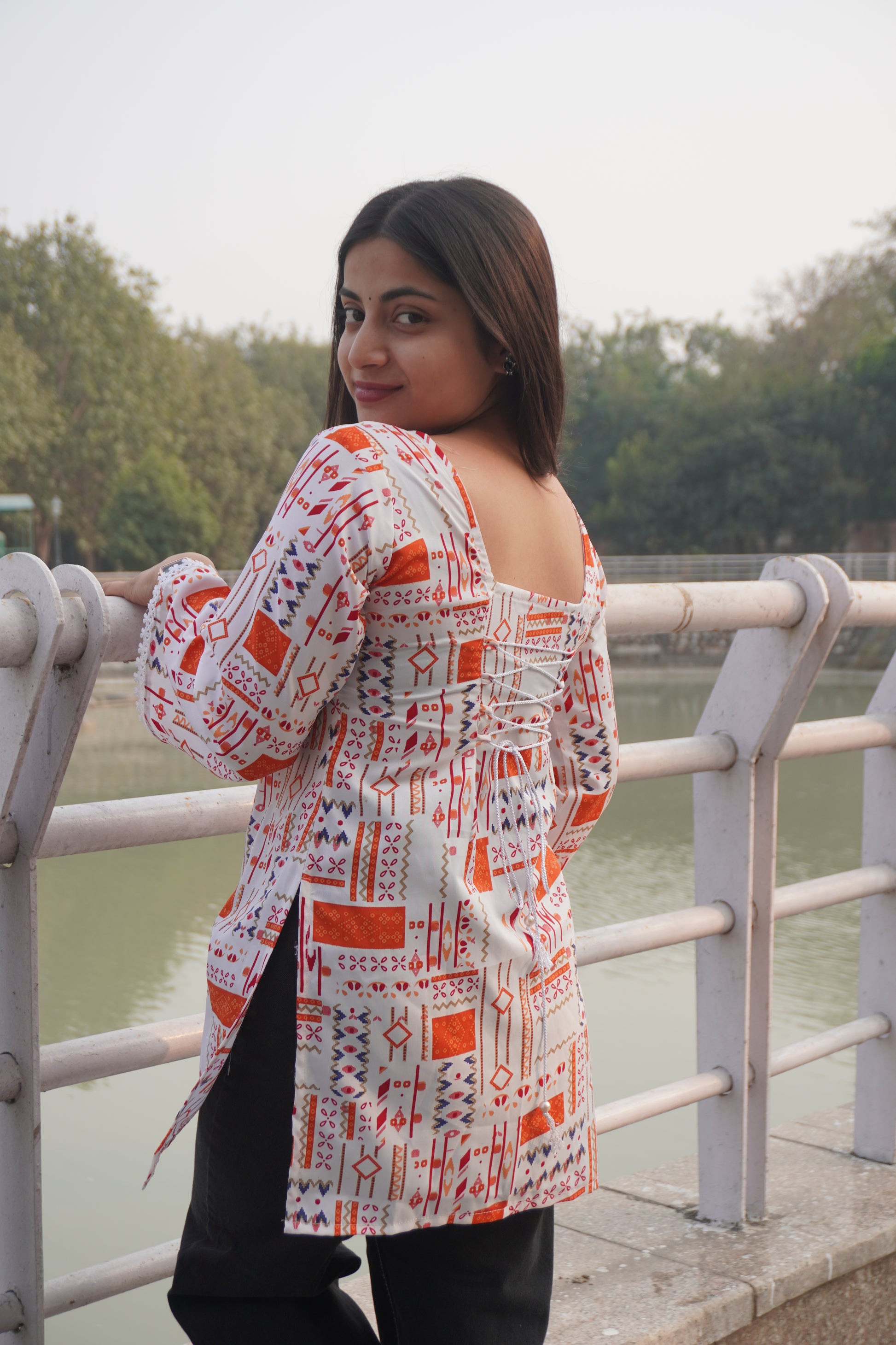 A chic printed short kurti with a structured neckline and elegant lace-up back, designed for effortless everyday style.